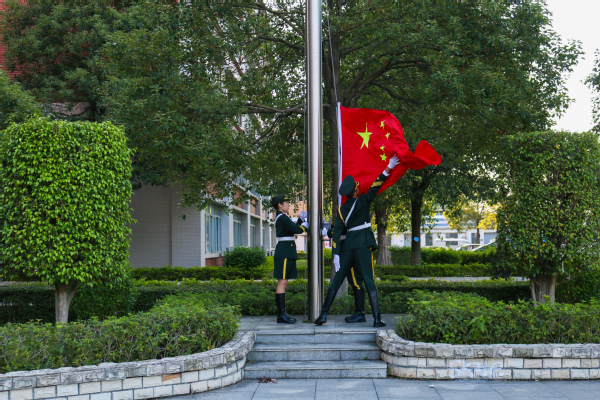 伴隨著莊嚴(yán)的《中華人民共和國(guó)國(guó)歌》,鮮艷的五星紅旗冉冉升起,全體師生面向國(guó)旗行使注目禮。