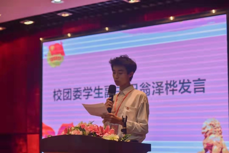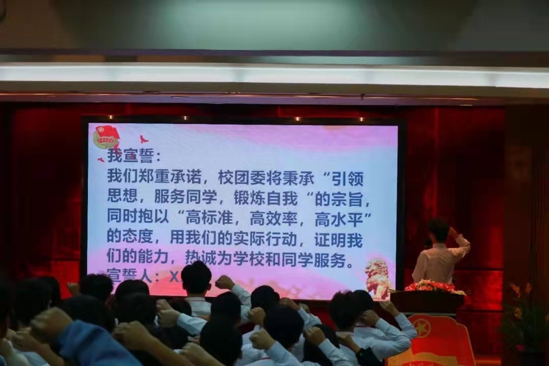 接著校團委書記處副書記翁澤樺同學上臺發(fā)言,他表示將秉承“引領思想、服務同學、鍛煉自我”的宗旨,要以負責任的態(tài)度對待各項工作,從嚴要求自己,共同為學校的發(fā)展作建設,隨后他帶領全體團委成員進行宣誓。