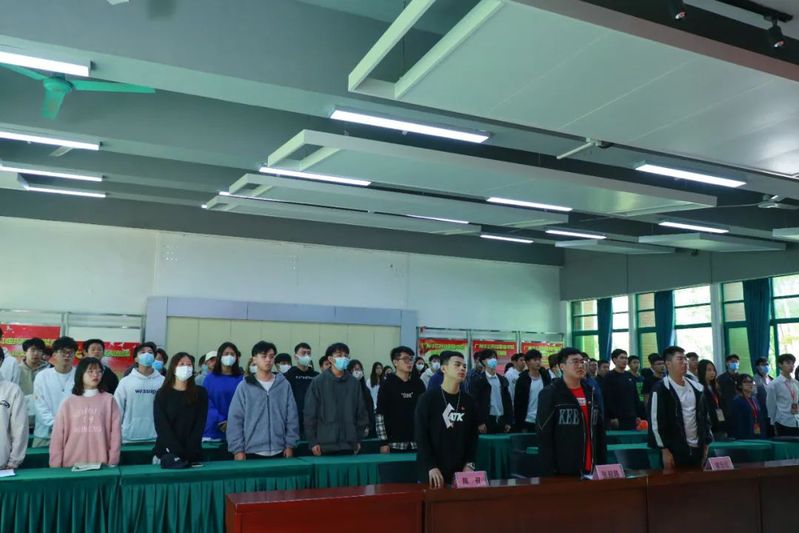在本次入團(tuán)儀式中,全體起立奏唱國歌。在主持人宣讀87位新入團(tuán)團(tuán)員名單后,由梁安達(dá)老師為新團(tuán)員代表佩戴團(tuán)徽,組織部副部長鄒明佳帶領(lǐng)新團(tuán)員宣誓。