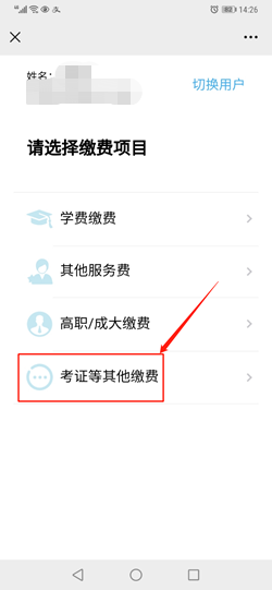 第二步:在最下邊的右下角點(diǎn)擊“快捷服務(wù)”—點(diǎn)擊“在校生繳費(fèi)”,輸入“身份證和姓名”,點(diǎn)擊“考證等其他繳費(fèi)等”。