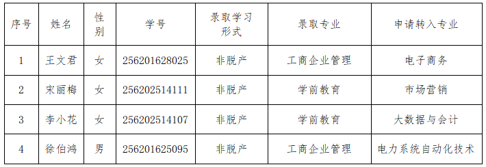 根據(jù)我校《成人高等教育學(xué)生學(xué)籍管理規(guī)定》,由學(xué)生本人申請,現(xiàn)有王文君等4名學(xué)生遞交了轉(zhuǎn)專業(yè)申請,經(jīng)繼續(xù)教育學(xué)院初步審核,擬同意王文君等4名學(xué)生的轉(zhuǎn)專業(yè)申請。現(xiàn)將這些學(xué)生的轉(zhuǎn)專業(yè)信息進(jìn)行公示(見下表),公示期時間從2025年6月4日起至2024年6月10日止。