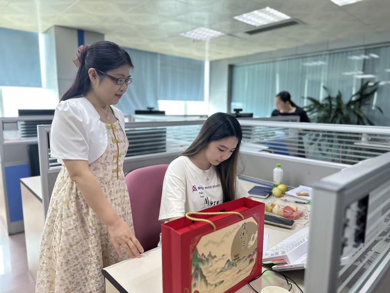 慰問期間,陳改梅書記與李雅琪同學(xué)進行了親切交談,詳細了解了她在實習(xí)崗位上的工作內(nèi)容、生活狀況以及實習(xí)收獲。陳書記親手將代表團圓和祝福的月餅禮盒送到李雅琪手中,對她能夠在中國電信這樣的大型國企穩(wěn)定實習(xí)、鍛煉自我表示了充分肯定。