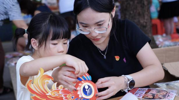 村民們?cè)诜沁z體驗(yàn)區(qū)親手嘗試雙節(jié)彩扎魚(yú)燈,讓指尖觸碰傳統(tǒng)技藝的溫度;在互動(dòng)游戲中猜燈謎,讓歡笑裝點(diǎn)團(tuán)圓的時(shí)光。志愿者手把手教學(xué)的同時(shí),穿插講解“非遺中的紅色故事”,將文化傳承與黨建教育巧妙結(jié)合。這些活動(dòng)背后,是“政校企農(nóng)”協(xié)同創(chuàng)新理念的實(shí)踐,更是高校對(duì)“以文化人、以美育人”的踐行。