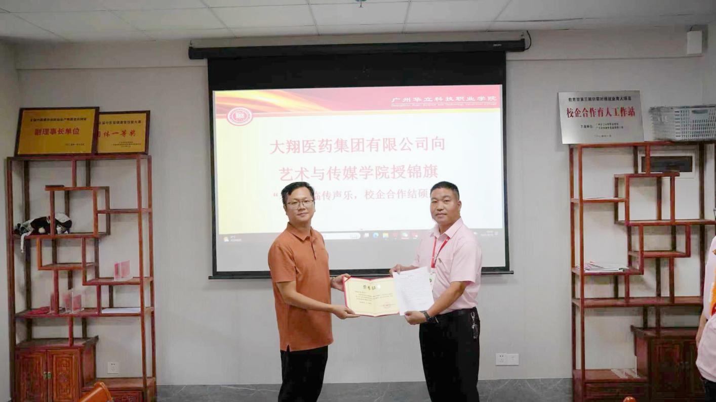 為表達誠摯謝意,大翔中藥向藝術與傳媒學院朱君院長頒發(fā)了榮譽證書,表彰其以卓越的藝術造詣和豐富經(jīng)驗,為大翔中藥企業(yè)文化建設增添光彩。同時,企業(yè)還向?qū)W院團隊頒發(fā)了錦旗,以感謝師生團隊在本次合作中的突出貢獻。
