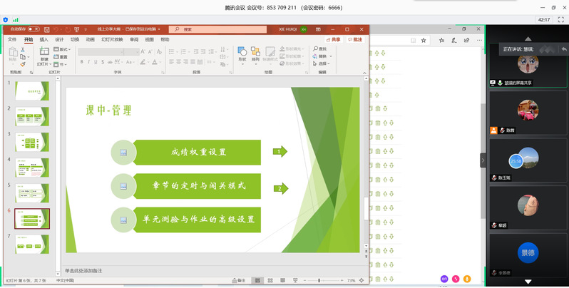 會(huì)上,隗波揚(yáng)副院長(zhǎng)首先代表學(xué)院部署了本學(xué)期的工作。謝慧琪老師根據(jù)自己親身教學(xué)經(jīng)驗(yàn)向大家分享了超星平臺(tái)教學(xué)以及網(wǎng)絡(luò)教學(xué)小技巧,楊金玲老師根據(jù)自己所教學(xué)的校級(jí)精品在線課程《英語(yǔ)寫(xiě)作》,在會(huì)議上分享了釘釘、超星等平臺(tái)教學(xué)經(jīng)驗(yàn)以及具體如何通過(guò)軟件錄課。尤前前老師分享了自己的考證課程網(wǎng)絡(luò)教學(xué)經(jīng)驗(yàn)。莫令航老師則向大家介紹了雙語(yǔ)課程網(wǎng)絡(luò)課程教學(xué)經(jīng)驗(yàn)。