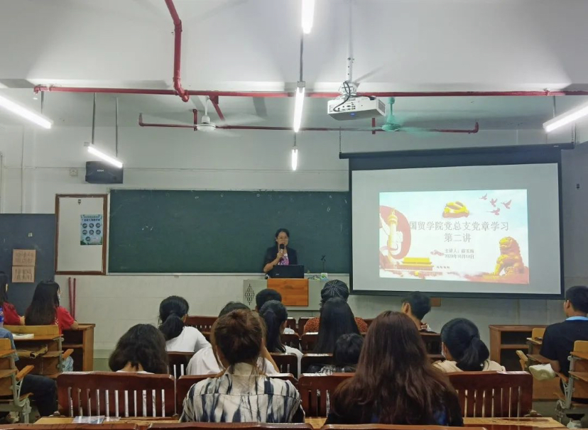 2020年10月14日周三晚上7:00,國(guó)際經(jīng)濟(jì)與外語(yǔ)學(xué)院黨總支在西一411開(kāi)展了黨章第二講活動(dòng)。由薛玉梅老師為同學(xué)們授課。開(kāi)展本次黨章第二講活動(dòng)的主要目的是幫助新同學(xué)們熟悉入黨流程以及更深入的了解中國(guó)共產(chǎn)黨。