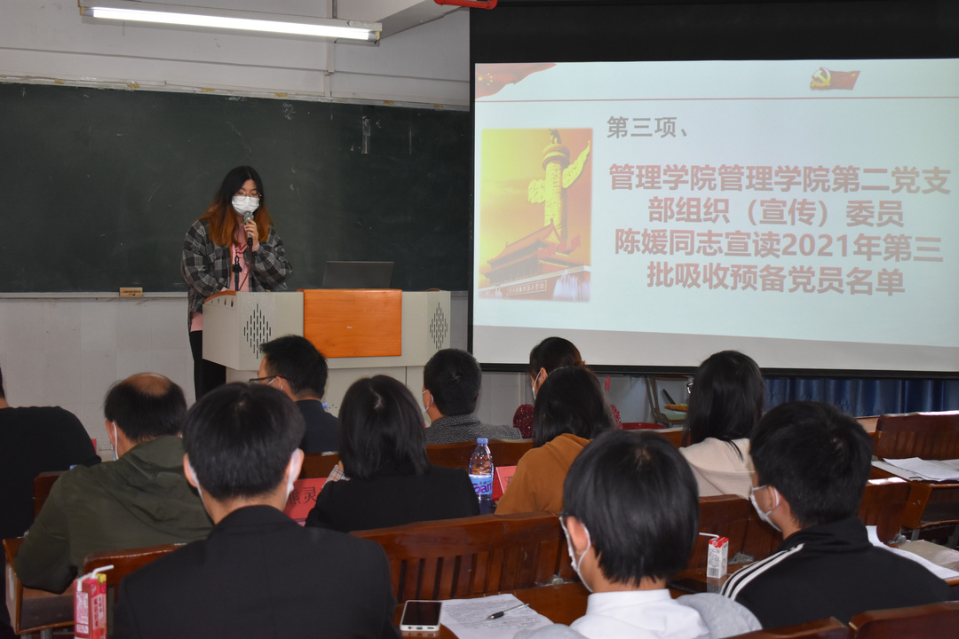 由管理學院第二黨支部組織(宣傳)委員陳媛同志宣讀2021年第三批吸收預備黨員名單。