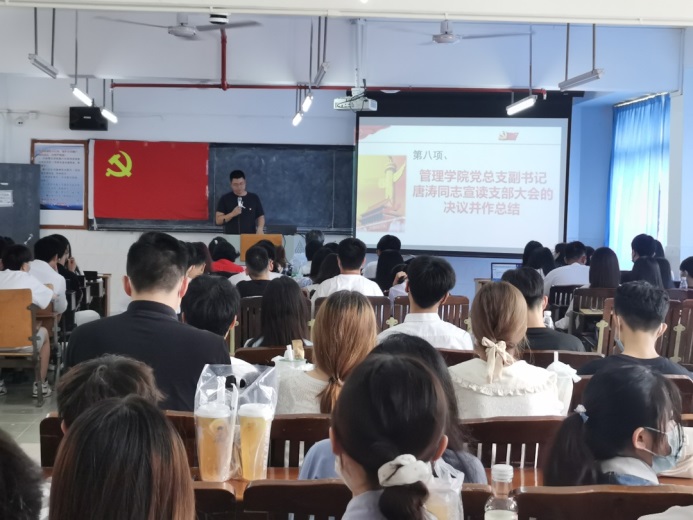 最后,由黨總支副書記兼第二黨支部書記唐濤同志宣讀支部大會的會議并作總結(jié)。