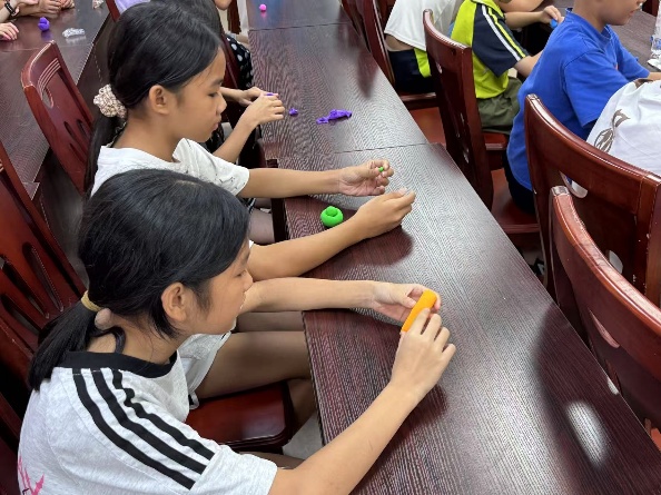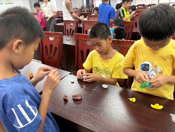 粘土元寶制作環(huán)節(jié)則充滿了歡聲笑語。隊(duì)員們帶來了五顏六色的粘土,手把手地教小朋友們制作粘土元寶。大家圍坐在一起,跟著大學(xué)生們的步驟,揉、捏、搓,不一會(huì)兒,一個(gè)個(gè)形態(tài)各異的粘土元寶就制作完成了。有的小朋友還發(fā)揮自己的想象,在元寶上加上了一些具有鄉(xiāng)村特色的裝飾。