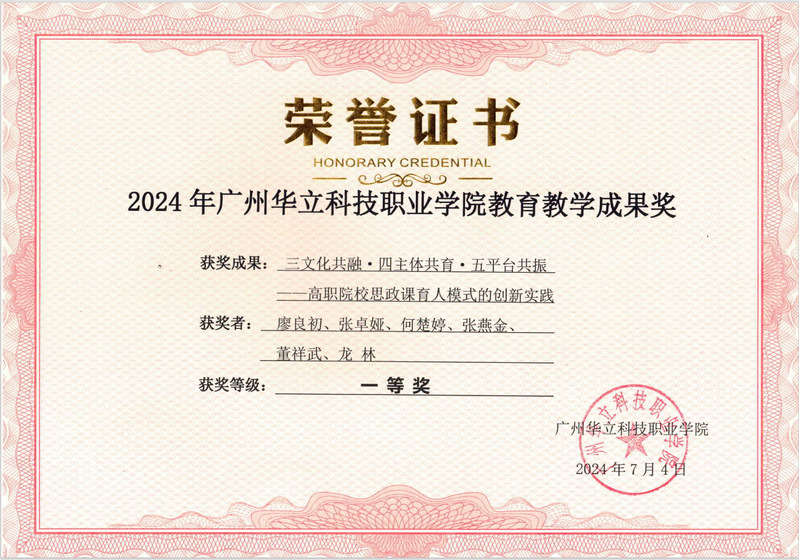 近日,學校2023年度教學成果獎評選結果揭曉,我院院長廖良初教授牽頭申報的《三文化共融?四主體共育?五平臺共振——高職院校思政課育人模式的創(chuàng)新實踐》項目喜獲一等獎。